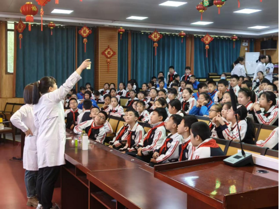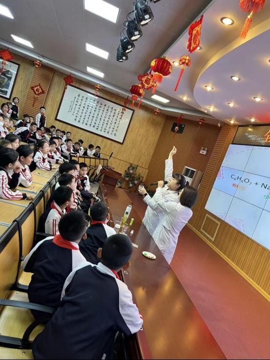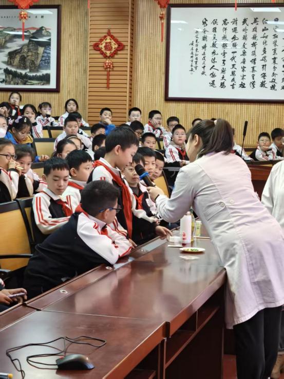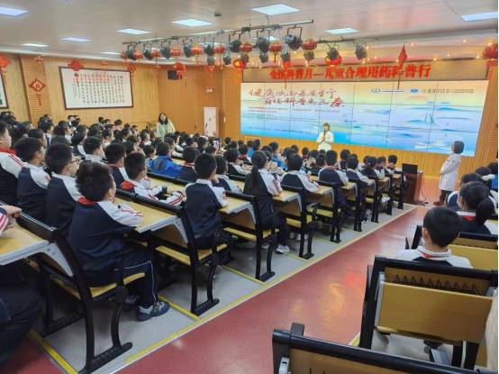 我院临床药学科曹小雨药师担任主讲专家。活动伊始,她以三个贴近生活的小故事作为引入,结合真实案例,用通俗易懂的语言向同学们阐释了安全用药的重要性。在随后的互动环节中,临床药师团队通过生动有趣的药学小实验,直观展示了错误服用泡腾片可能带来的风险,并现场演示了颗粒剂、干混悬剂及散剂等常见剂型的正确服用方法。同学们积极参与,现场气氛热烈。最后,药师们引导同学们辨识不同种类的药品,详细讲解处方药与非处方药的区别,以及正确服药的注意事项。孩子们认真聆听、踊跃发言,在轻松的氛围中逐渐熟悉了各类药品剂型,不再感到“陌生”。