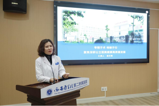 随后,我院美容整形医院院长俞文娟以《专精于术,特新于行——聚焦深耕公立医院医美健康高质量发展》为题作专题报告。她从“科室概况、医美市场环境与挑战、新媒体运营实践、管理模式创新、‘专、精、特、新’发展路径、公立医美品牌建设思考”六大维度,详细分享了我院在医美领域的实践成果、创新举措与发展思路,为同行提供可借鉴的“公立医美发展样本”。