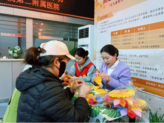 4.折花映秋 悦重阳:志愿者指导老人制作“长寿之花”手作,成品赠予老人,寄托对其健康长寿的美好祝愿;