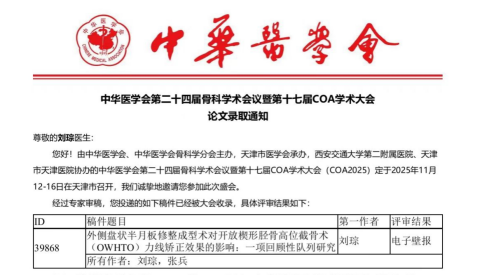 骨一科团队在张兵主任的带领下,已连续四年积极投稿COA,展现了科室在学术领域的持续活跃与积累。在2023年,团队共有3篇论文进行大会发言;2024年,有2篇论文发言;进入2025年,团队投稿数量达到24篇,创下历史新高,其中3篇为论文发言,15篇为电子壁报,6篇为书面交流。团队先后在关节镜与运动医疗会场、创新与转化会场、关节会场,就《胫骨高位截骨术结合自体骨软骨移植术治疗膝关节骨性关节炎合并Koshino(Ⅲ、Ⅳ期)股骨髁骨坏死的疗效评价》《基于数字化下肢轴向加压技术的胫骨高位截骨术精准化术中验证体系构建与临床转化》《OWHTO新探索:内固定位置与术区周围疼痛的关系与分析》等课题作了学术报告,充分展示了团队的研究深度与创新活力。