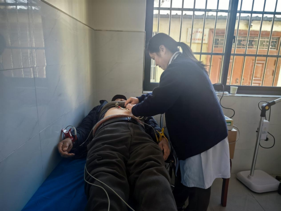 上午10时,义诊活动在油房坪村党群服务中心前的小广场正式启动。由我院心血管内科、神经内三科、中医科、肾脏内分泌科、眼科、门诊超声科和心电图室组成的医疗团队,携带便携式彩超机、十二导联心电图仪、全自动血糖仪、电子血压计等设备,迅速完成场地布置与准备工作。在工作人员的耐心引导下,现场群众有序排队、依次候诊,各项检查工作有条不紊推进。超声检查室,医务人员手持探头凝神细察,紧盯屏幕细节,不时询问群众既往病史,全力排查健康隐患;血压血糖测量点前,医务人员手法娴熟地操作仪器,精准记录数据,同时结合检测结果,用通俗易懂的语言贴心叮嘱饮食禁忌、作息调理等日常注意事项;心电图检查中,医务人员细致捕捉每一项指标,确保诊断结果准确可靠……我院医疗团队专业的诊疗与暖心的服务,让现场群众倍感亲切。