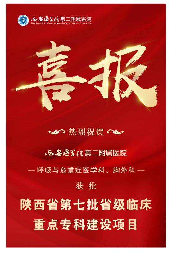 近日,陕西省卫生健康委员会正式公布第七批省级临床重点专科建设项目名单。我院呼吸与危重症医学科、胸外科凭借深厚的学科积淀、强劲的技术实力与优质的医疗服务,经过机构自评、省级评审、网络公示等多轮严格遴选,成功获批。这一喜讯不仅是对两个科室多年来深耕细作、精益求精的高度肯定,更是西安医学院第二附属医院在学科建设道路上稳步前行、再创佳绩的有力见证。