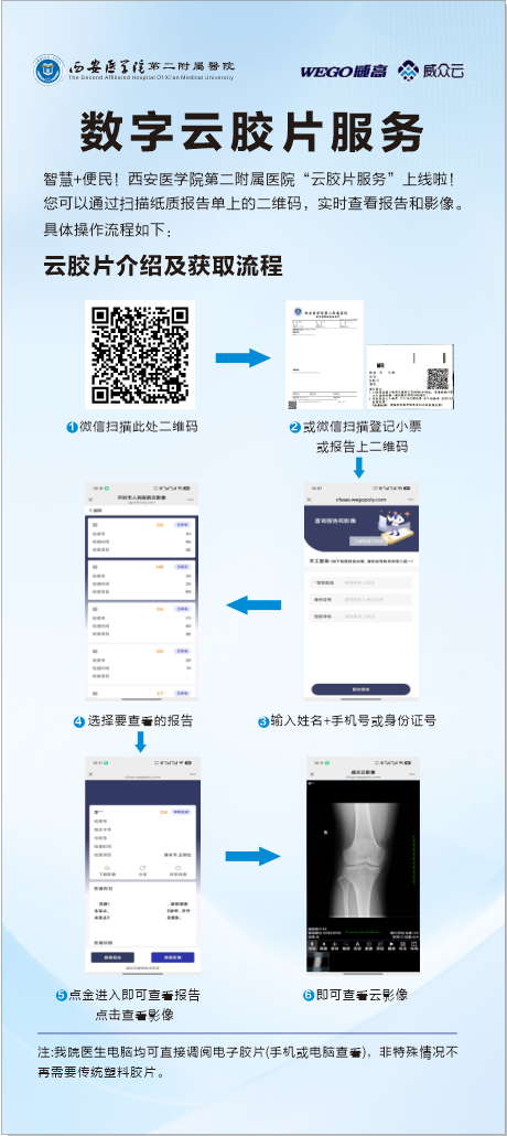 未来,患者在我院完成影像检查后,无需等待,可直接通过医院公众号线上查询报告与图像。我院医学影像科将以智慧医院建设为抓手,坚持以患者为中心,持续深化数字医疗创新,推出更多便民惠民举措,以智慧影像赋能临床诊疗,拓展人工智能辅助诊断与远程诊疗服务,全方位守护人民群众身体健康。(附我院云胶片获取流程)