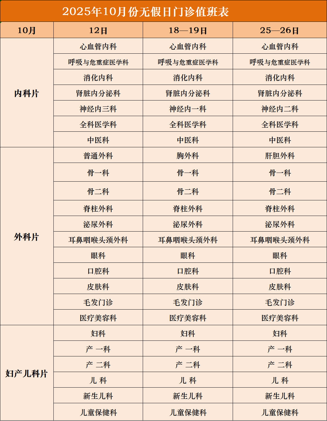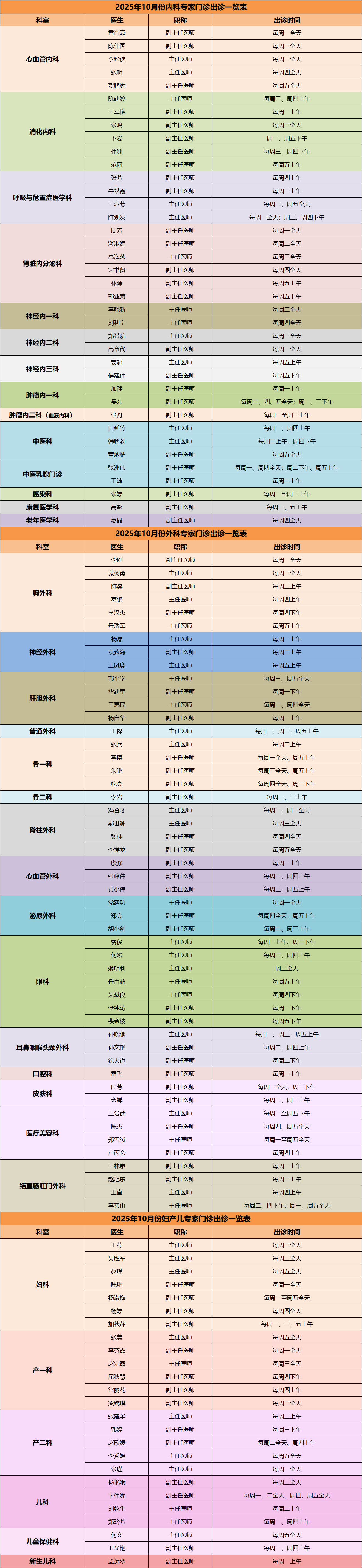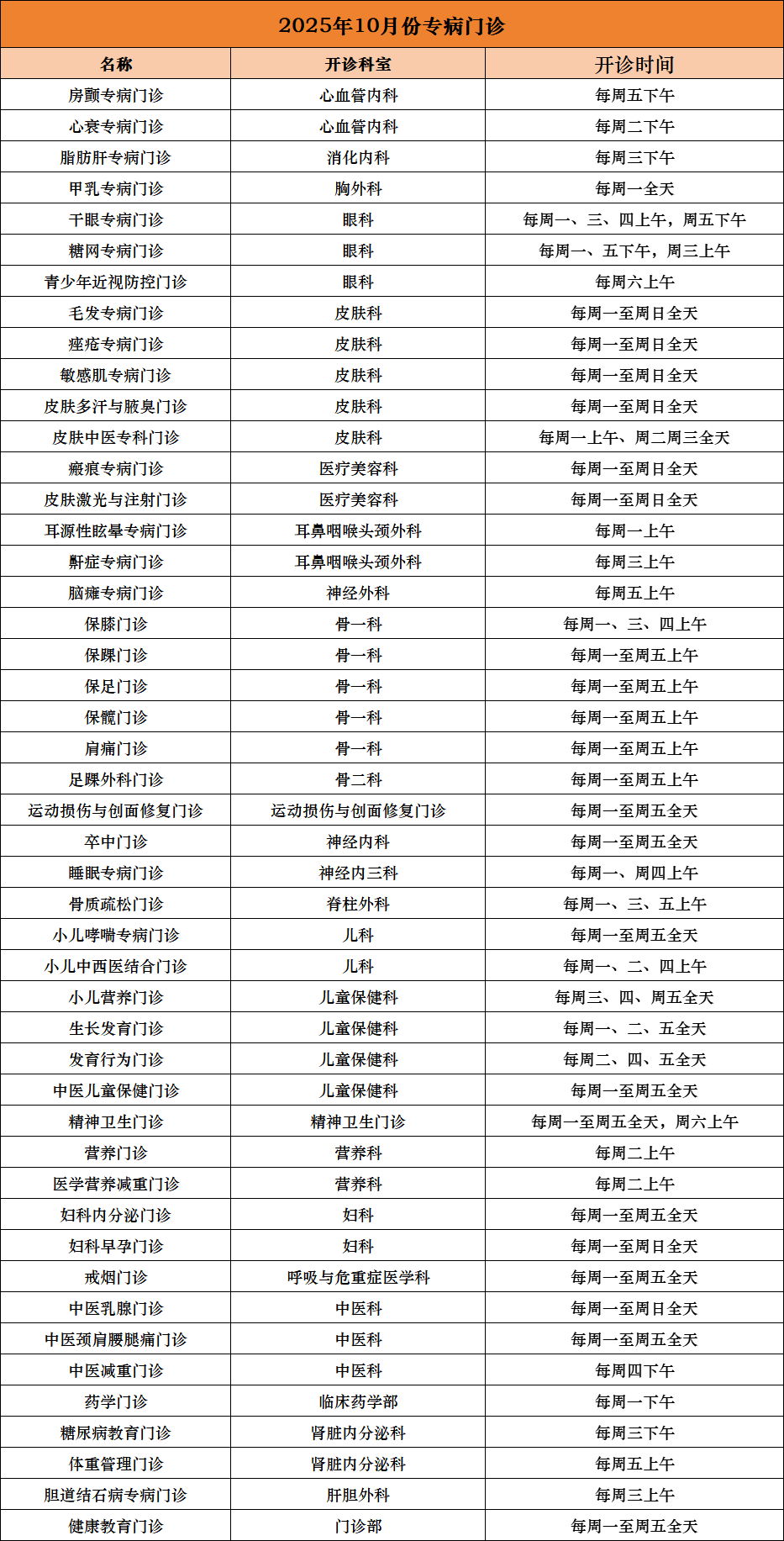 为了方便您提前做好就医安排,现将我院10月份120余位专家出诊信息及周末门诊、夜间门诊、专病门诊信息公布如下,您可根据情况提前预约挂号。同时我们为老年人现场预留号源,并协助挂号就医!