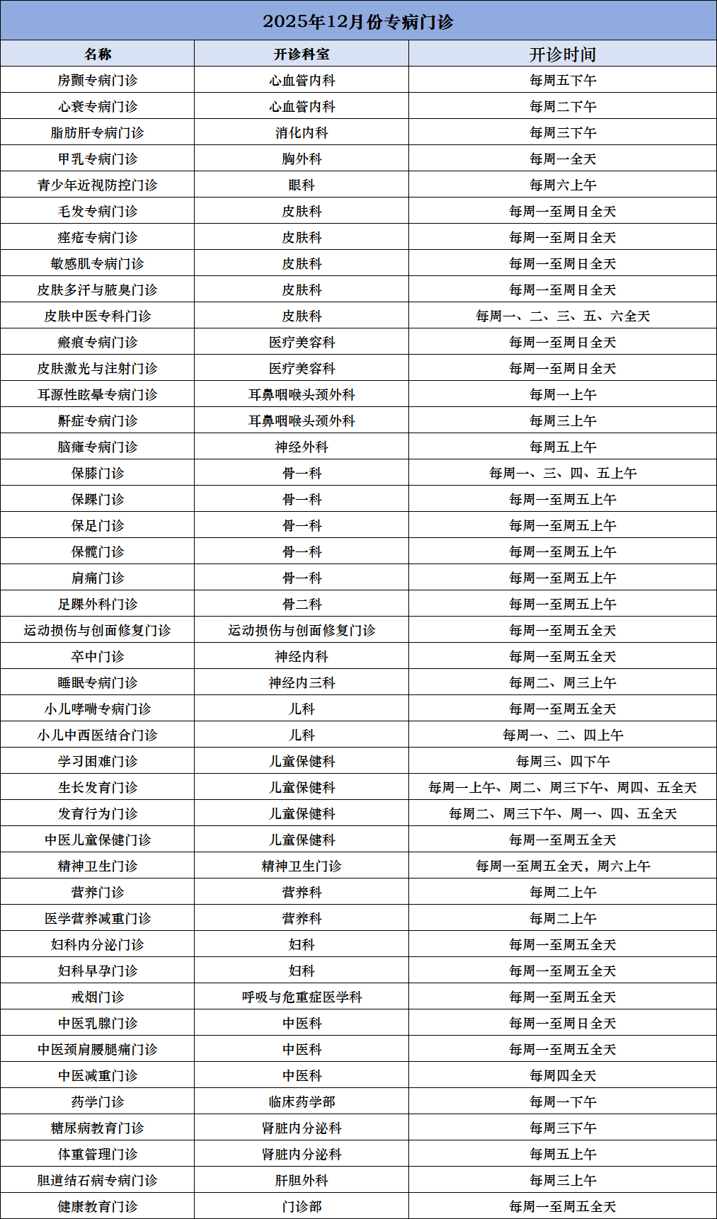 12月专家门诊出诊时间表