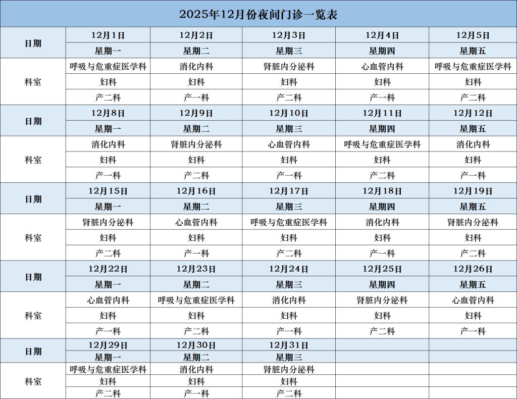 备注:眼科、耳鼻咽喉头颈外科、泌尿外科等科室夜间门诊均有值班医生接诊。