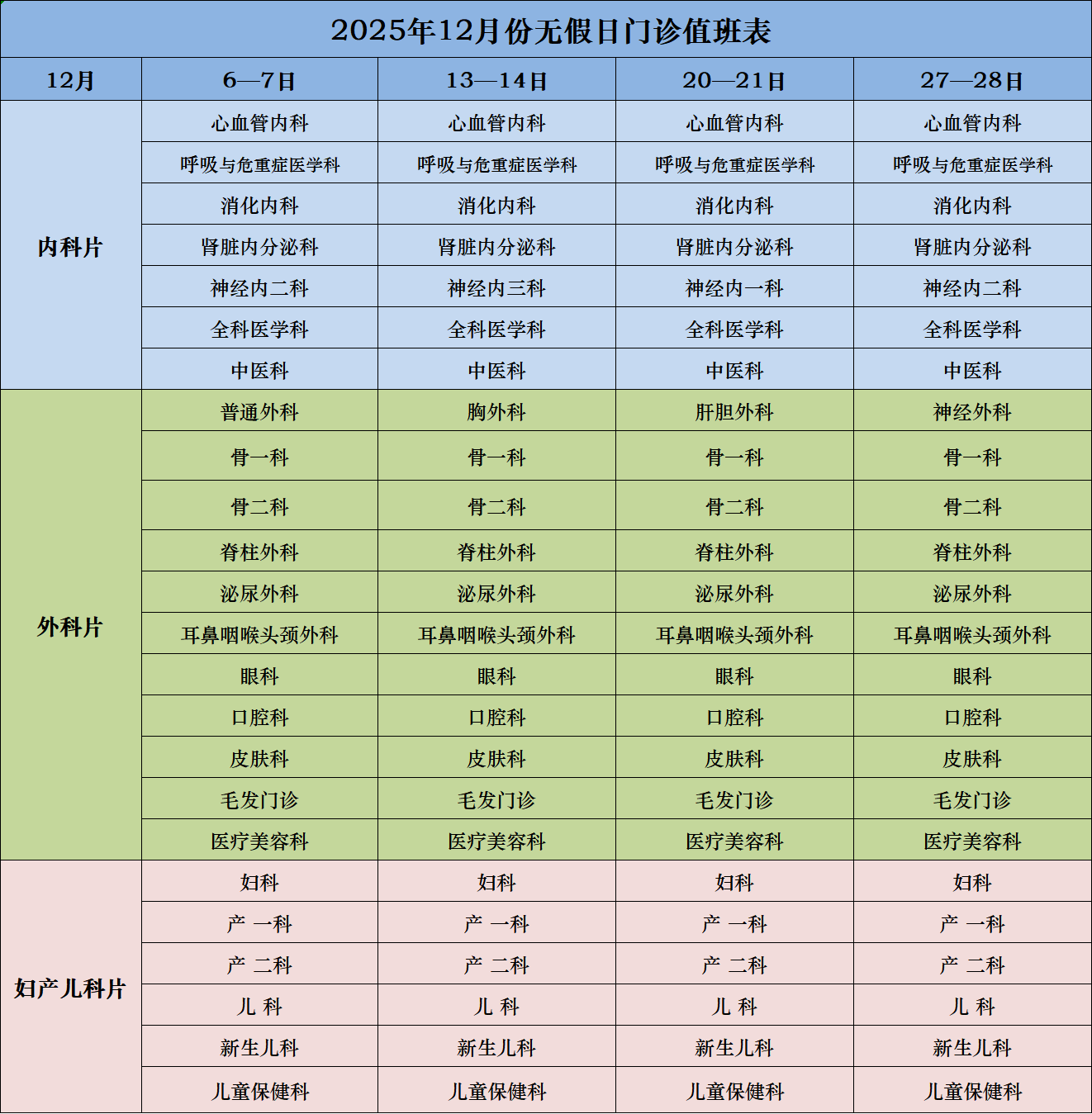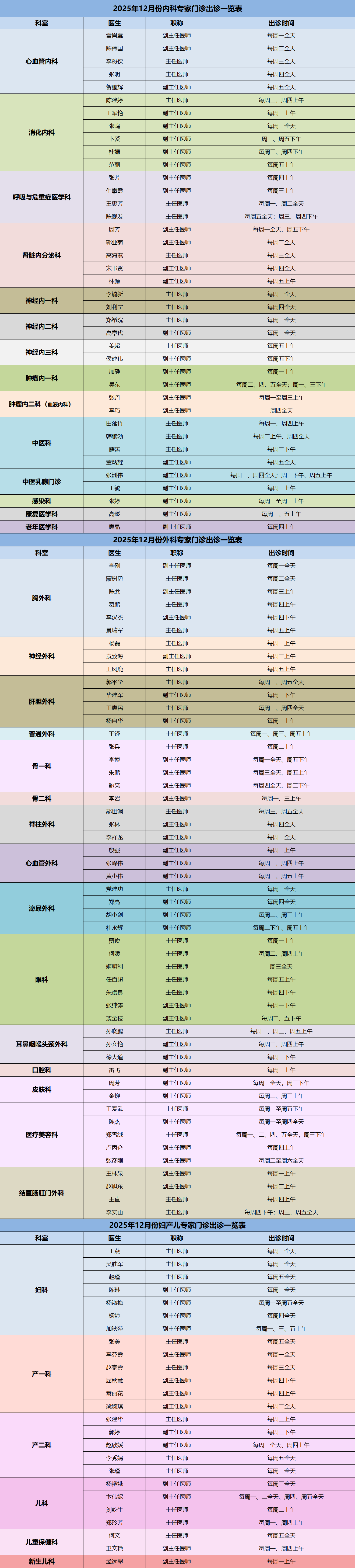 2025年12月门诊出诊信息安排