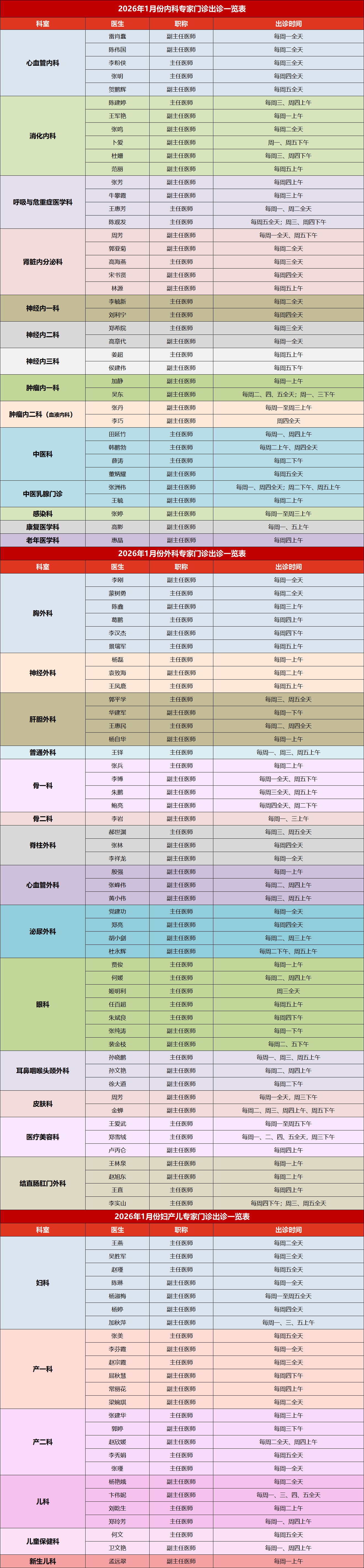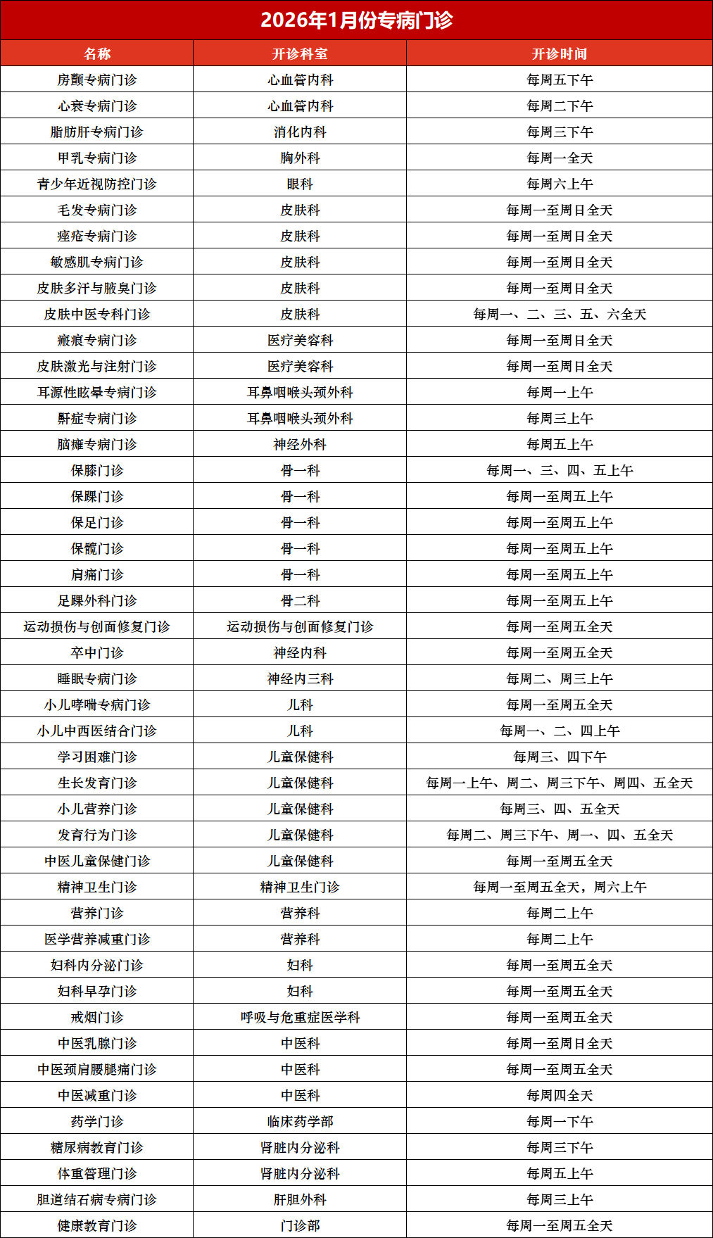 为了方便您提前做好就医安排,现将我院1月份120余位专家出诊信息及周末门诊、夜间门诊、专病门诊信息公布如下,您可根据情况提前预约挂号。同时我们为老年人现场预留号源,并协助挂号就医!