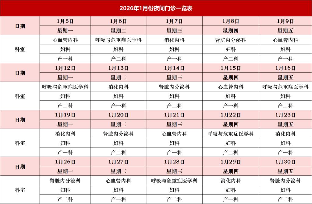 备注:眼科、耳鼻咽喉头颈外科、泌尿外科等科室夜间门诊均有值班医生接诊。