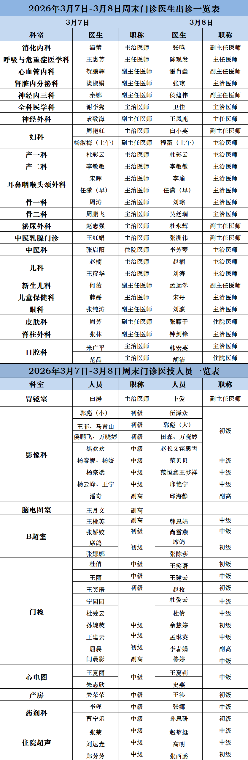 周六、周日门诊医生出诊表