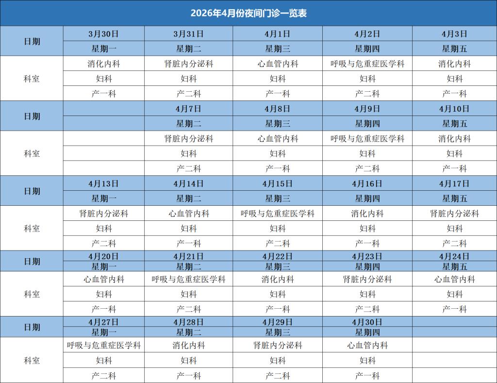 备注:眼科、耳鼻咽喉头颈外科、泌尿外科等科室夜间门诊均有值班医生接诊。