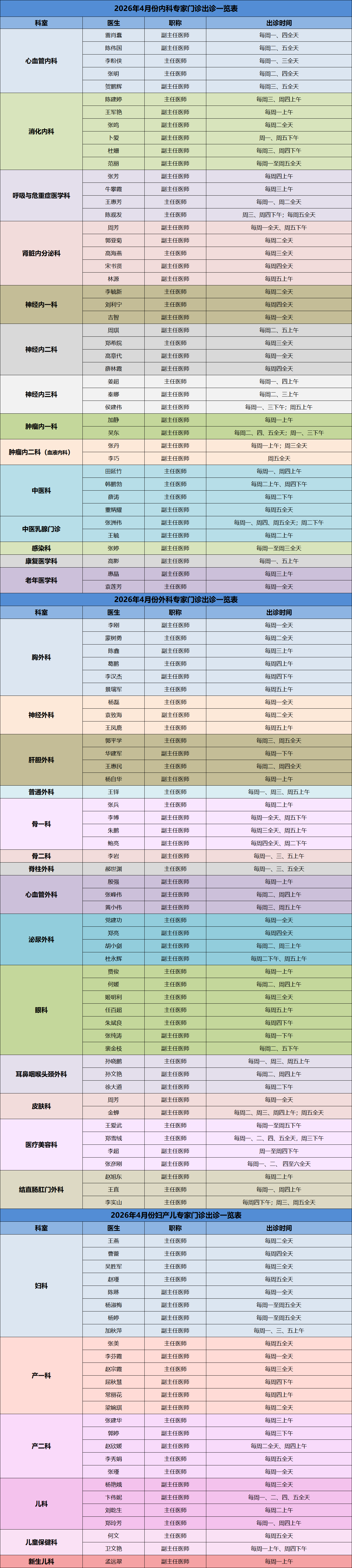 4月份专家门诊出诊时间表