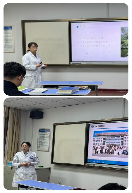 儿科学教研室马歆花主治医师则以《从未名湖畔到儿科课堂的AI之旅为题,从人工智能的概念发展、在医学领域的发展及在医学教育领域的发展等方面进行了分享讲解,并就在专业课程教学中如何融入提出了自己的思考与建议。