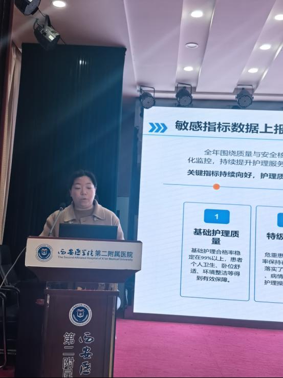 随后,灞桥区护理质控中心秘书宋春苗代表灞桥区护理质控中心,对2025年灞桥区护理质控中心年终工作进行了汇报,并对2026年重点工作进行了部署。她提出,需持续推进护理敏感指标监测、不良事件规范化管理等重点工作。来自灞桥区中医医院、庆华医院、纺织医院等单位的护理负责人分别围绕日常质控开展、敏感指标应用、不良事件管理等方面进行了工作汇报,汇报内容务实具体,展现了基层护理质控工作的积极探索与实践成效。